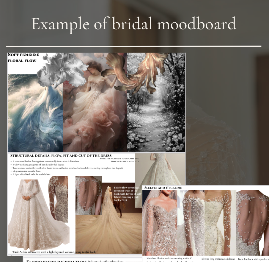 During our initial meeting with our bride, we spend time getting to know her and her style. The whatβs and Howβs of her personality. We then create a mood board to match her vision and send them to the shortlisted designers for them to present ideas and styles accordingly
